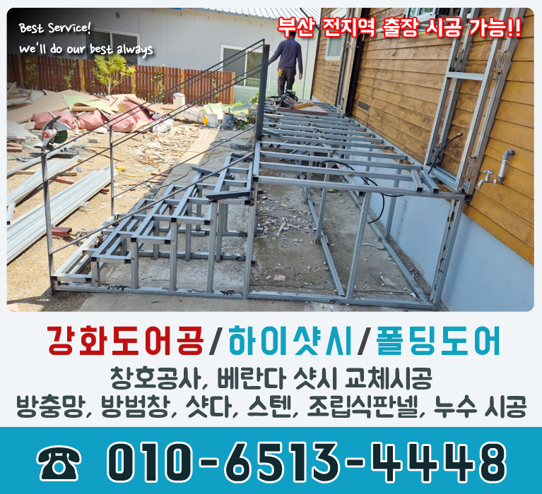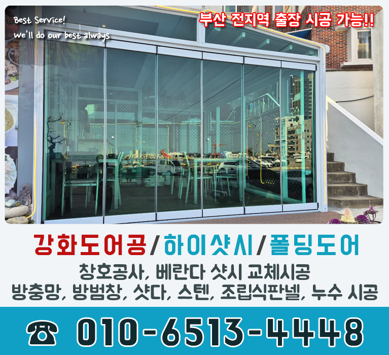 부산시강화도어, 하이샷시, 폴딩도어, 창호공사, 베란다샷시교체시공, 방충망, 방범창, 조립식판넬, 샷다, 누수공사, 화정건업